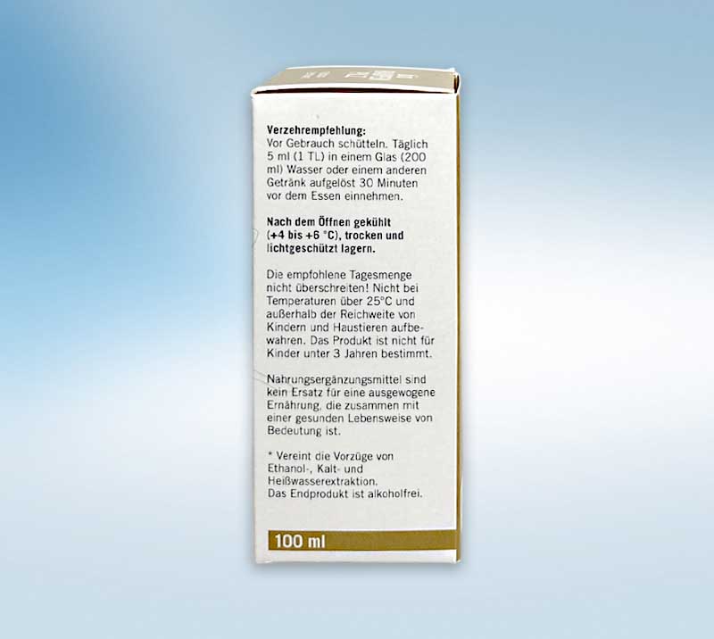 Flüssigextrakte haben eine deutlich höhere Bioverfügbarkeit. Die Inhaltsstoffe sind bereits gelöst und müssen nicht erst im Magen aufgespalten werden. Zudem entspricht eine Portion (5 ml) der Wirkstoffmenge von fast 40 Kapseln – das spart Ihnen das Schlucken vieler Tabletten.