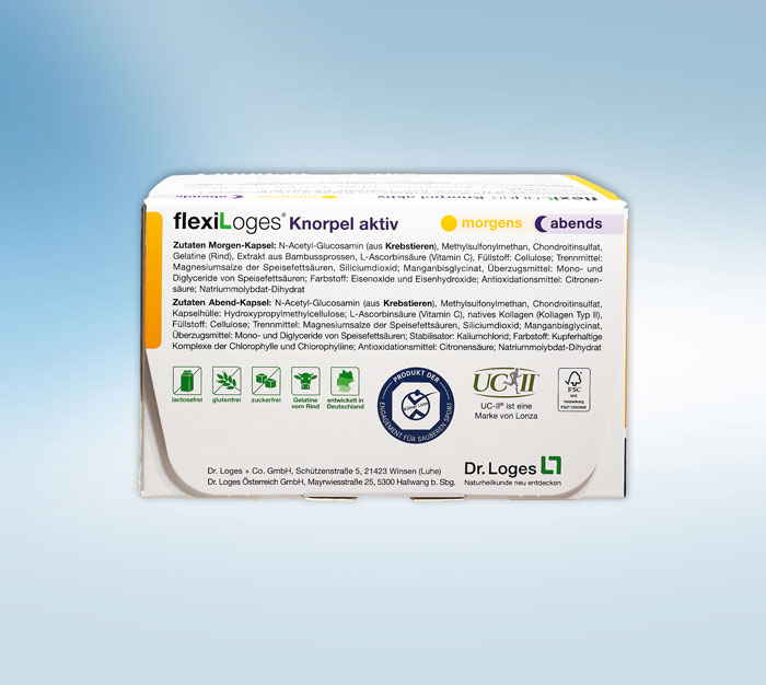 Knorpel und Bindegewebe bestehen zum Großteil aus Kollagen, das als natürlicher Baustein dient. Anders als herkömmliche Gelenk-Nahrung, enthält flexiLoges® Knorpel aktiv das besondere Kollagen UC-II®. Dank eines patentierten Herstellungsprozesses bleibt das undenaturierte Kollagen – im Gegensatz zu herkömmlichem denaturiertem Kollagen – in seiner natürlichen Konzentration und biologischen Aktivität erhalten. Aufgrund der besonderen Formulierung sind die benötigten täglichen Aufnahmemengen an Kollagen deutlich reduziert. Damit es dem Körper während des Schlafens zur Verfügung steht, ist es nur in der Abend-Kapsel enthalten.