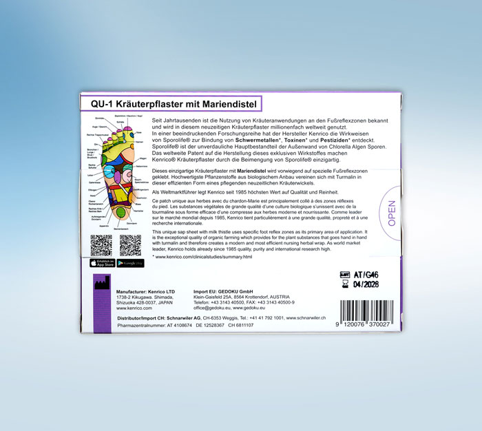 Ihre Leber ist Ihr wichtigstes Entgiftungsorgan. Unterstützen Sie dieses zentrale Reinigungssystem Ihres Körpers auf einfache und traditionelle Weise – über Nacht, an Ihren Fußreflexzonen. Die Kenrico QU-1 Kräuterpflaster vereinen die bewährten Methoden der traditionellen japanischen Kräuteranwendung mit der wissenschaftlich erforschten Kraft der Mariendistel.