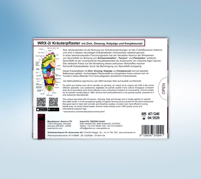 Das Kenrico WRX-2i Kräuterpflaster ist eine einzigartige Kombination aus Zimt, Ginseng, Kelpalge und Konjakwurzel, die speziell zur Aktivierung von Reflexzonen an den Füßen entwickelt wurde.